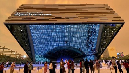 De igual manera, lo que llama la atención es su gran sistema audiovisual instalado en el piso del pabellón por lo que al estar en el interior de esta construcción transporta a sus visitantes a un viaje cautivador de la historia, el patrimonio, la naturaleza y la visión del futuro de Arabia Saudita.