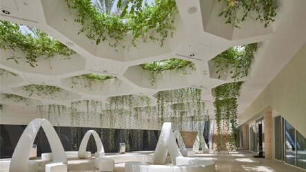 Lo más destacado del diseño es que cuenta alrededor de 8000 luces LED formando una enorme pantalla de espejo LED en su fachada, así mismo tiene una fuente de agua interactiva de 32 m de largo e instalados 700 paneles solares, lo que le convierte en una estructura sostenible.