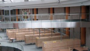 Los atrios de distribución y pasillos con acceso a las salas de lectura están distribuidos en los tres niveles que forman la base del depósito y alrededor de un núcleo central, permitiendo al visitante orientarse claramente en el espacio interior sin perder tiempo en la búsqueda de la sala correspondiente.