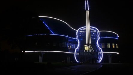 Un detalle especial es cuando llega la noche, el borde de la estructura se ilumina, dejando entrever el contorno del piano y del violín, así como las cuerdas de éste último.