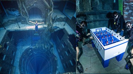 Los buzos pueden jugar al futbolín y otros juegos en el fondo, así como explorar una «ciudad hundida abandonada» o simplemente empaparse de la vegetación en el camino.